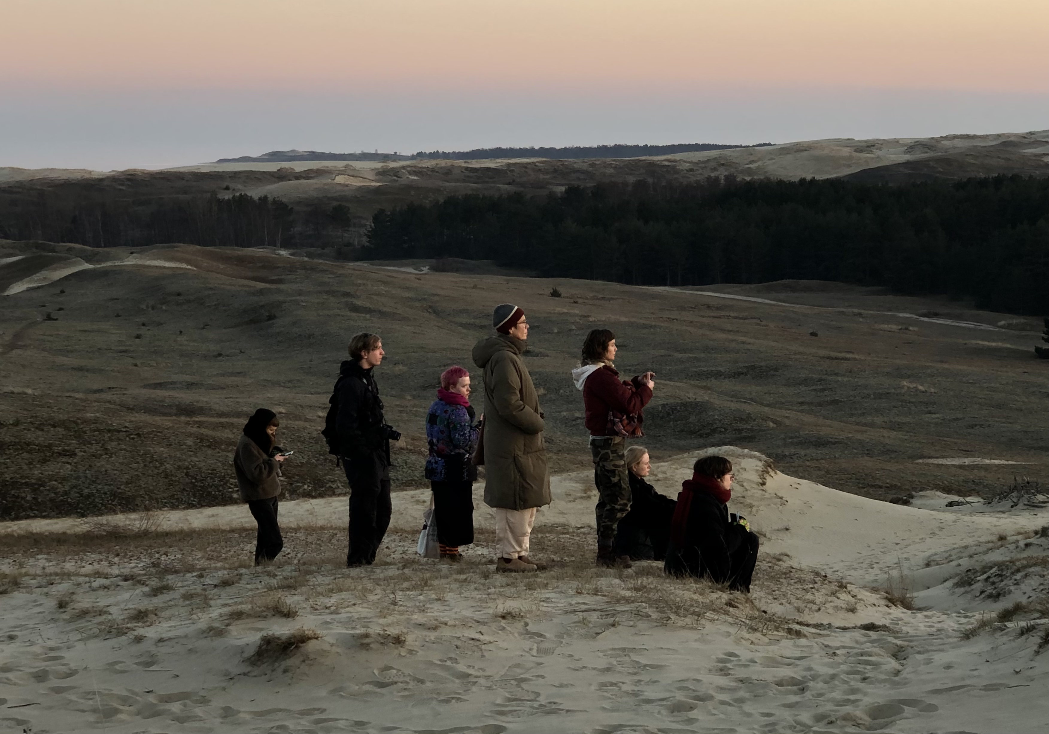 image: workshop participants observing the sunset in the Parnidis Dune, photo by Gabriele Globyte